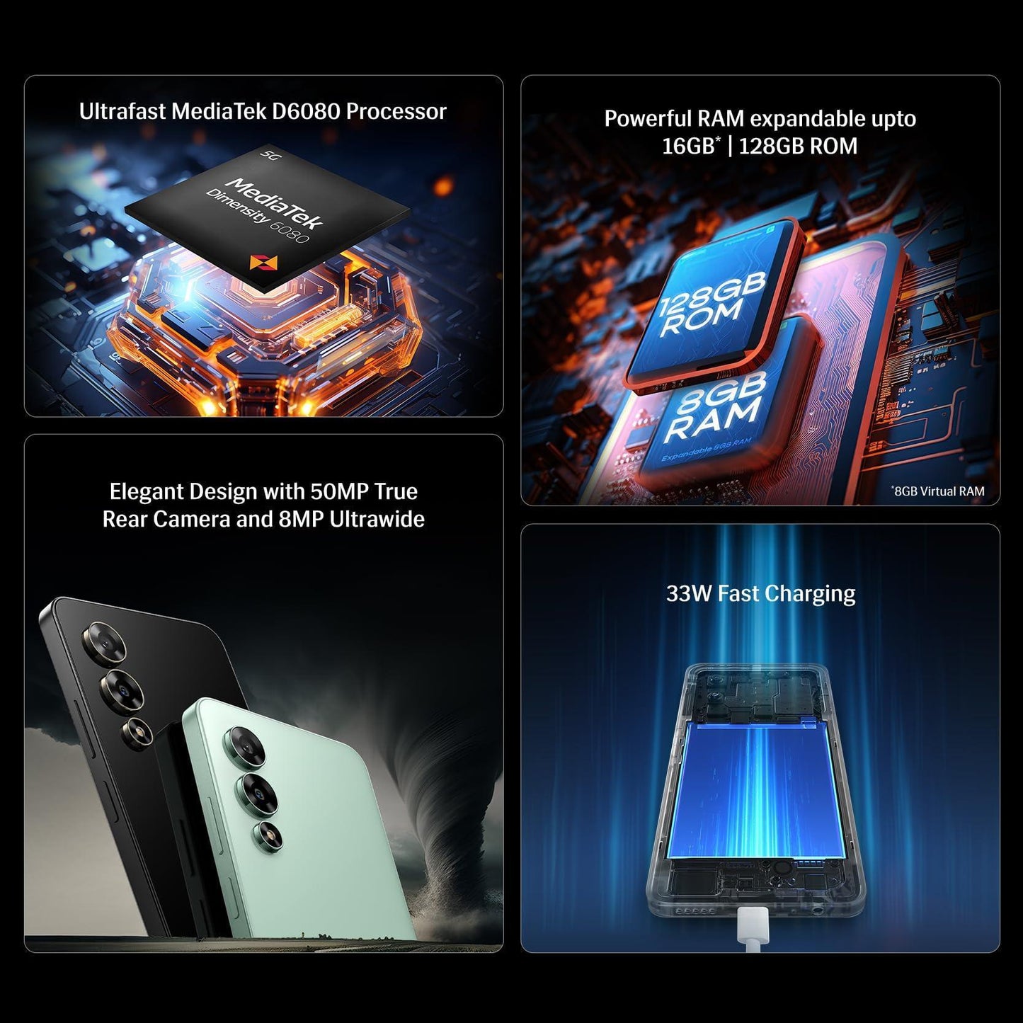Lava Storm 5G (Thunder Black, 8GB RAM, 128GB ROM), Premium Glass Back Design, MediaTek Dimensity 6080 Processor, 50MP+8MP Refurbished