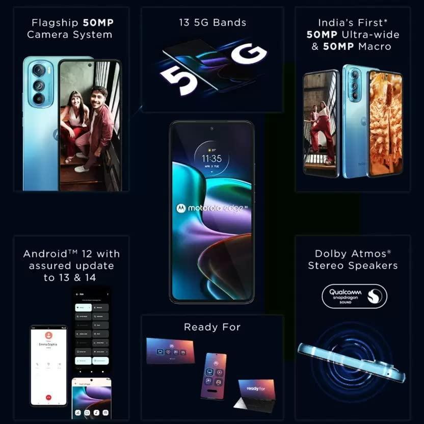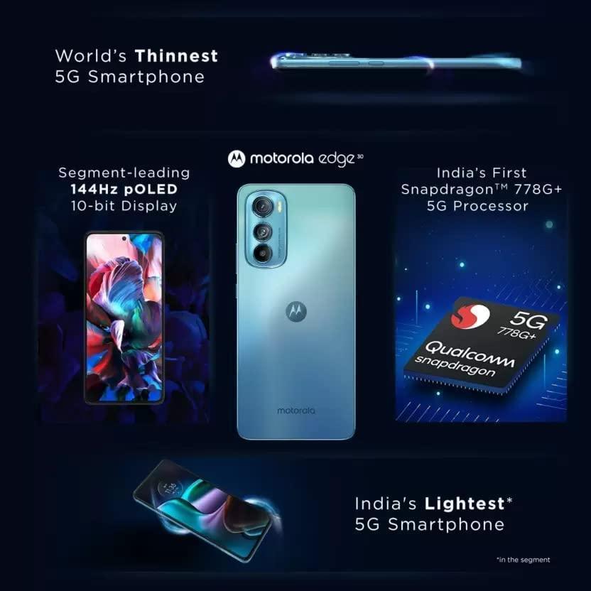 Details: Explore new ways to have fun and enjoy the distinctive features that this phone has to offer. The Motorola Edge 30 features a sleek and compact design with a thickness of 6.79 mm and weighing around 155 g which is capable of attracting anyone with its elegance. Furthermore, the fast refresh rate of 144 Hz and a unique pOLED display empowers you to enjoy brilliant visuals. Moreover, this smartphone sports an innovative Snapdragon 778G+ 5G processor that offers a smooth user experience, and this phone also features 6 GB of LPDDR 5 RAM and 128 GB of internal storage, enabling you to enjoy its top-notch performance and appreciate the incredible storage capacity that helps you store all that you want. Additionally, the Motorola Edge 30 sports a Quad-function camera setup with a 50 MP ultra-wide lens and a 50 MP macro lens that help in capturing terrific images with utmost details and impeccable clarity. Also, the 33 W TurboPower feature adapted in the battery of this phone powers up the battery in a short span, thus enhancing your performance