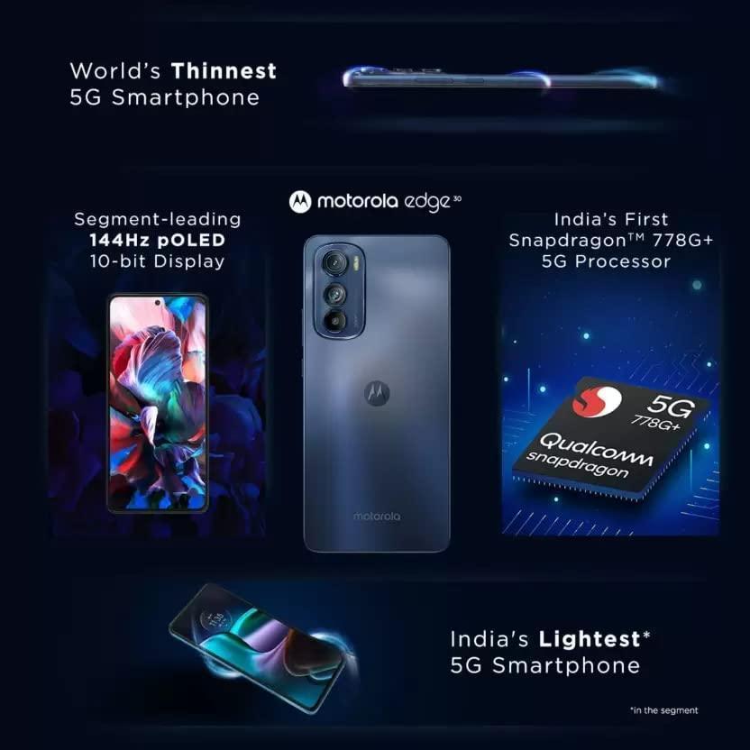Details: Explore new ways to have fun and enjoy the distinctive features that this phone has to offer. The Motorola Edge 30 features a sleek and compact design with a thickness of 6.79 mm and weighing around 155 g which is capable of attracting anyone with its elegance. Furthermore, the fast refresh rate of 144 Hz and a unique pOLED display empowers you to enjoy brilliant visuals. Moreover, this smartphone sports an innovative Snapdragon 778G+ 5G processor that offers a smooth user experience, and this phone also features 6 GB of LPDDR 5 RAM and 128 GB of internal storage, enabling you to enjoy its top-notch performance and appreciate the incredible storage capacity that helps you store all that you want. Additionally, the Motorola Edge 30 sports a Quad-function camera setup with a 50 MP ultra-wide lens and a 50 MP macro lens that help in capturing terrific images with utmost details and impeccable clarity. Also, the 33 W TurboPower feature adapted in the battery of this phone powers up the battery in a short span, thus enhancing your performance