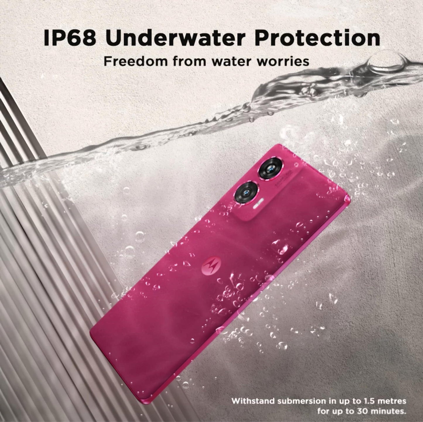 Details: 50 MP Ultra Pixel OIS Camera with Sony - LYTIA 700C Senor, IP68 Underwater Protection with Smart Water Touch, Beautifully Crafted Endless Edge Design in Vegan Leather Finish Motorola edge 50 fusion comes with an impressive design language. The symmetrical curved inlays align perfectly with your hand’s natural contours, 144 Hz 3D Curved Display with Gorilla Glass 5 Protection, Snapdragon 7s Gen 2 and upto 12 GB RAM, 68 W TurboPower Charging with 5000 mAh Battery, Hello UI Based Android 14 with 3 Years OS Update