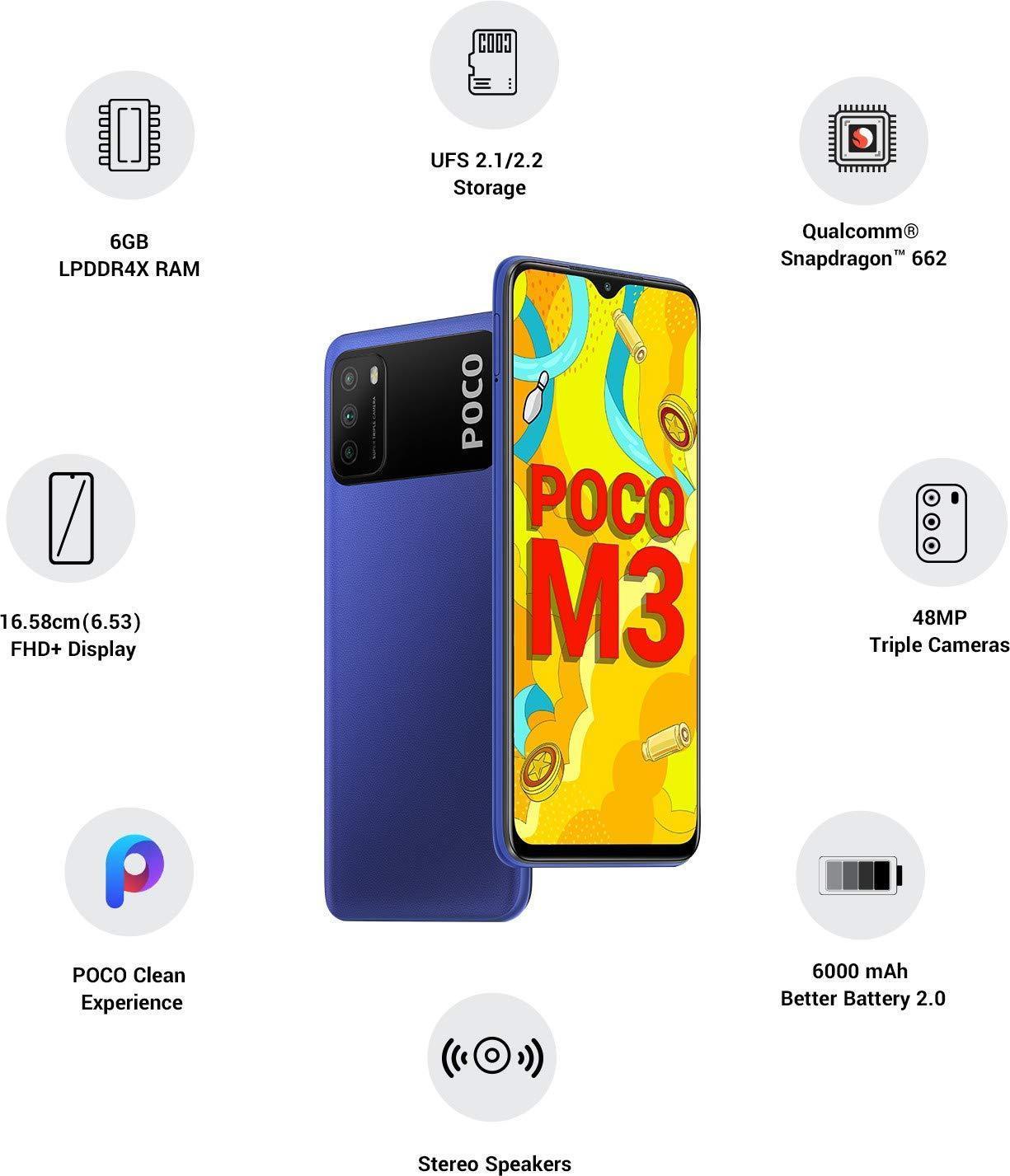 Details: POCO M3 Best Budget Tripple rear camera Smart phone 16.59 cm (6.53 inch) Full HD+ Display 6000 mAh Lithium-ion Polymer Battery Qualcomm Snapdragon 662 Processor, In The Box Handset, Power Adaptor, USB ...