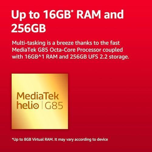• Processor: High performance MediaTek G85 ; Enhance gaming with 1GHz GPU | 12GB of RAM including 6GB virtual | 6.74" HD+ 90Hz display with Corning Gorilla Glass 3 Protection | 50MP AI Triple camera |Fast Side fingerprint | 5000mAh Battery