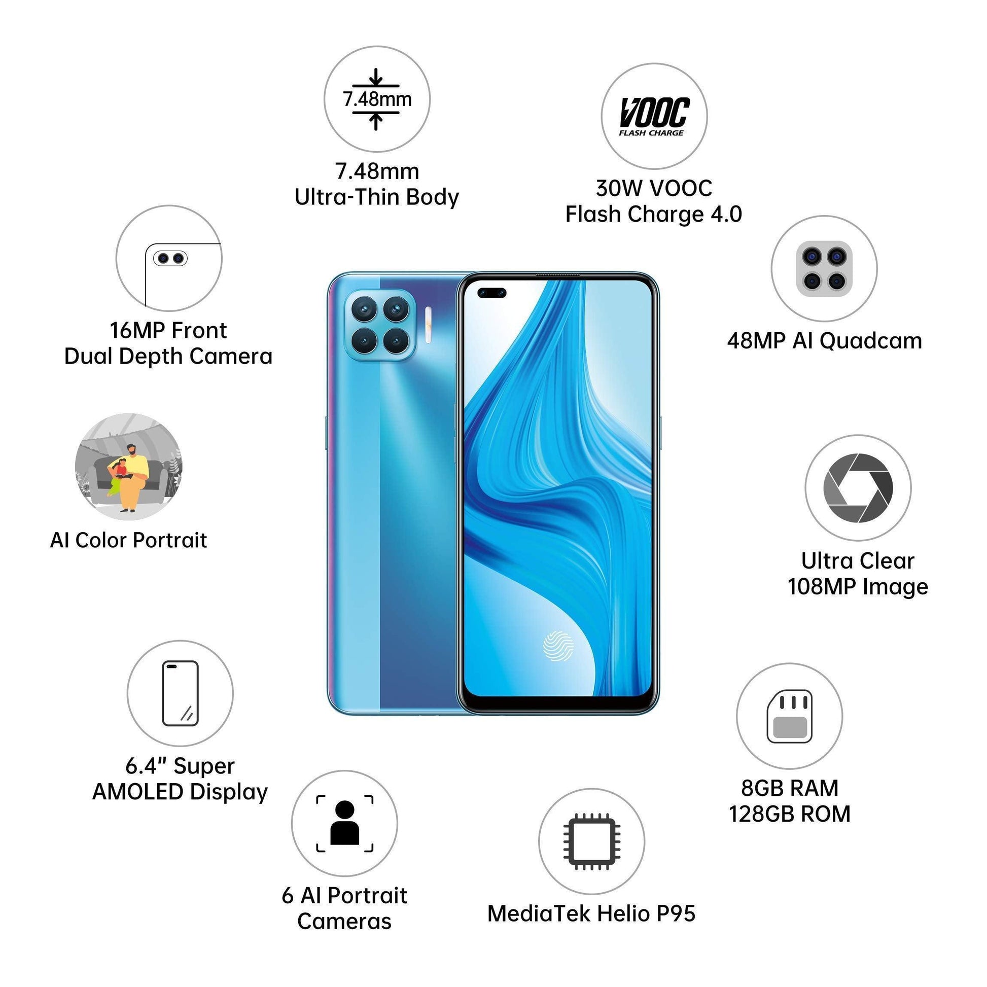 • Android 10 based ColorOS 7.2 operating system with 2.2GHz MediaTek Helio P95 octa core processor, IMG 9XM-HP8 GPU