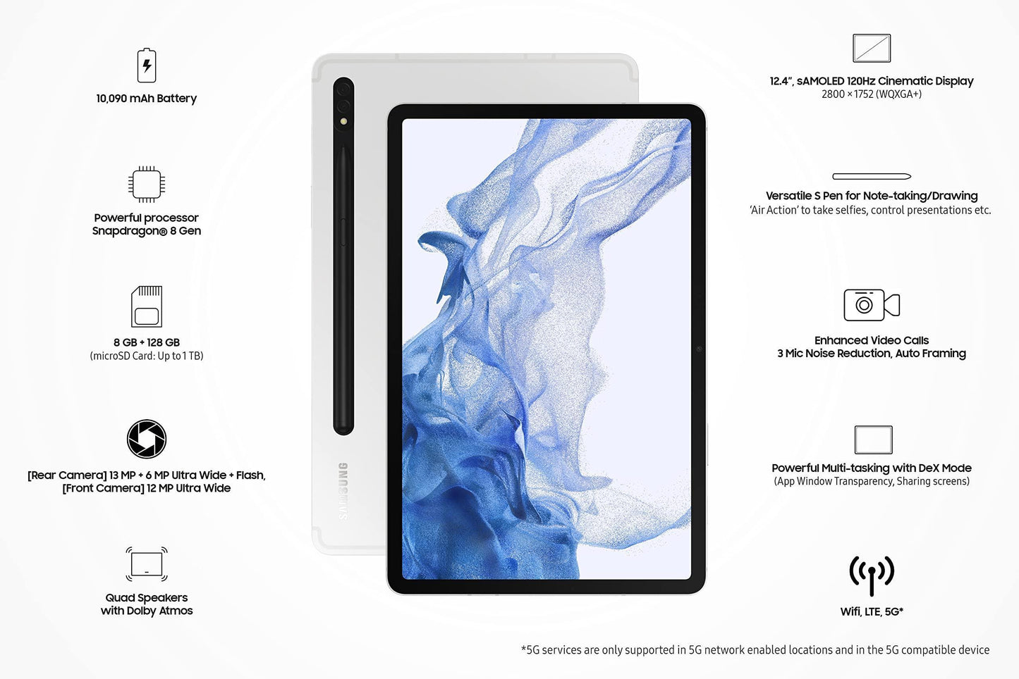 Samsung Galaxy Tab S8+ 31.49 cm (12.4 inch) sAMOLED Display, RAM 8 GB, ROM 128 GB Expandable, S Pen in-Box, Wi-Fi+ 5G Tablet, Silver