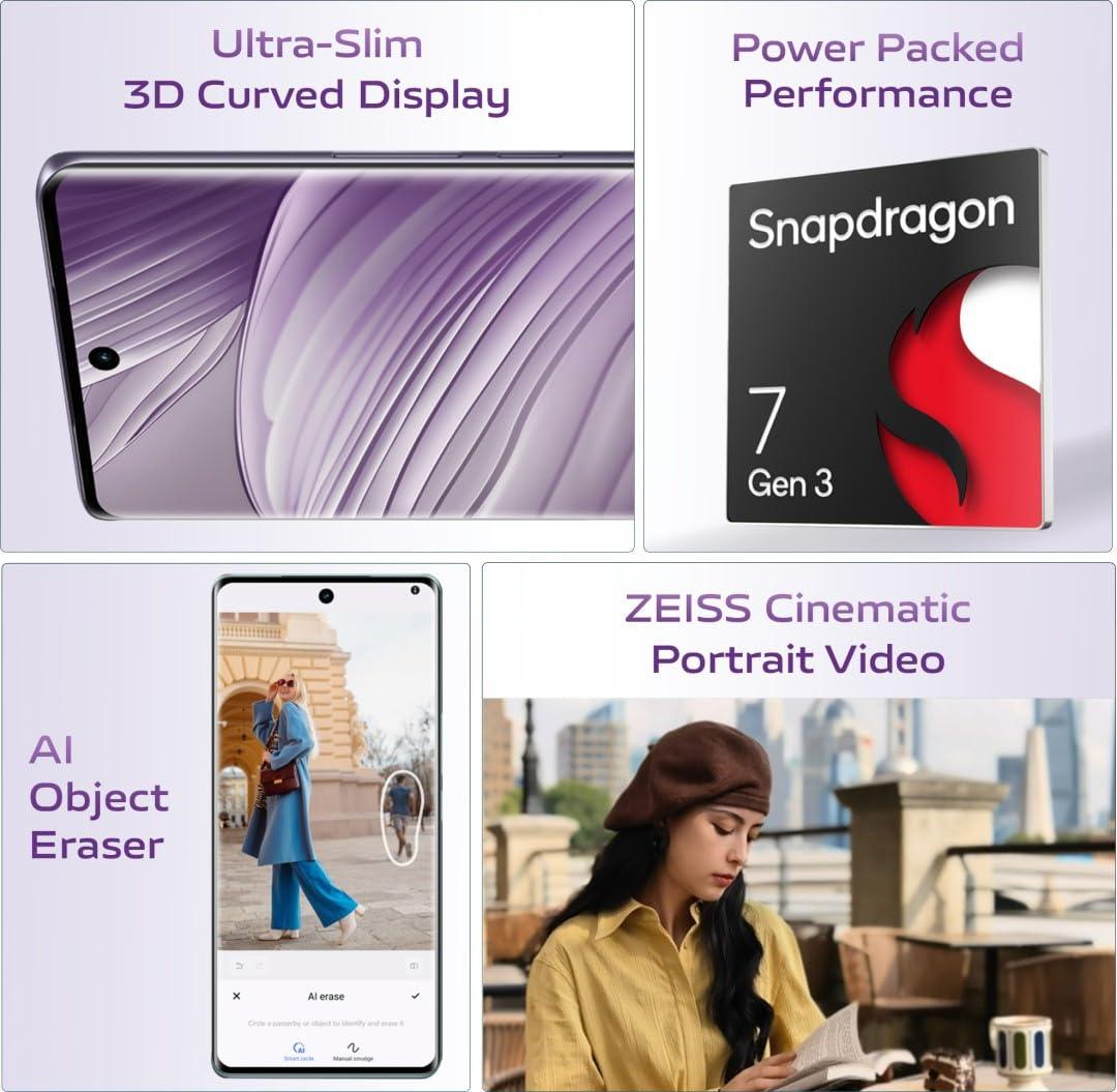 Details: Seamless Display Sporting a meticulously designed 6.78-inch 2800×1260 AMOLED display, the Vivo V40 5G 6.78-inch Smartphone renders vivid colours and rich details. Moreover, with a refresh rate of up to 120Hz, it reduces motion blur even when you’re watching a fast-action scene or playing a fast-paced game. Efficient Functionality Thanks to the quick Qualcomm Snapdragon 7 Gen 3 processor and 8GB RAM, this 6.78-inch smartphone offers seamless performance. It enables you to switch between apps, stream videos, and tackle demanding tasks with ease. Captivating Captures