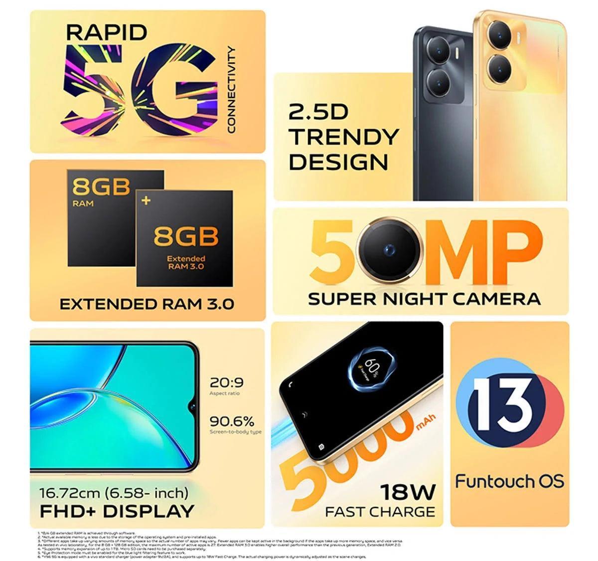 Buy Vivo Y Series Y56 5G Dual Sim Smartphone (8GB RAM, 128GB Storage) 6.58 inch FHD+ Display | MediaTek Dimensity 700 Processor(Black Engine) Refurbished mobile phones at the best price from Triveni World. Click for product feature details now.